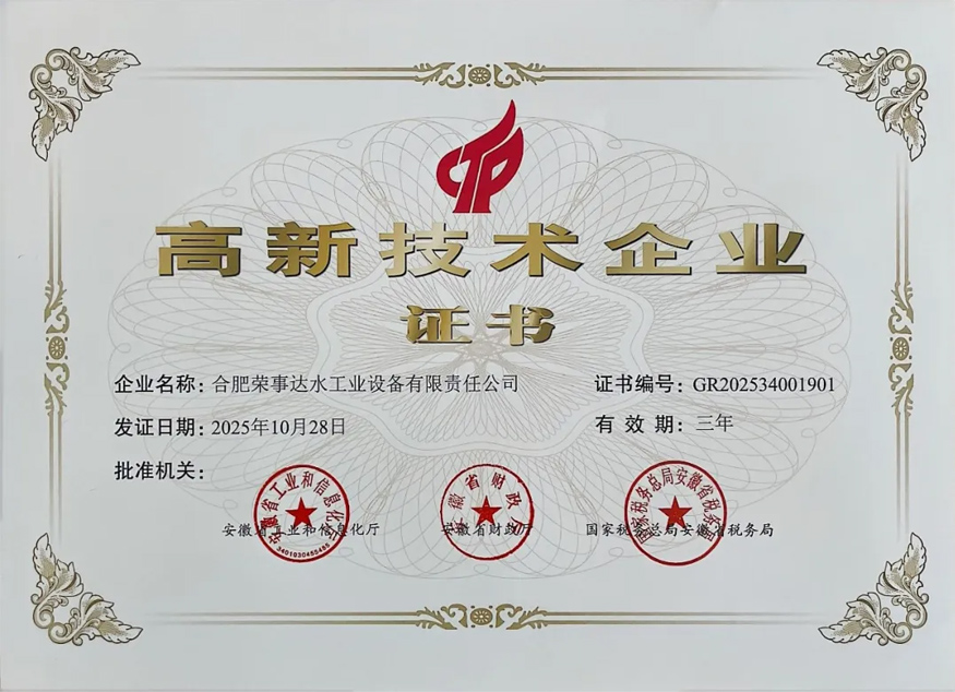 合肥榮事達(dá)水工業(yè)設(shè)備有限責(zé)任公司通過(guò)高新技術(shù)企業(yè)認(rèn)定,榮獲由...