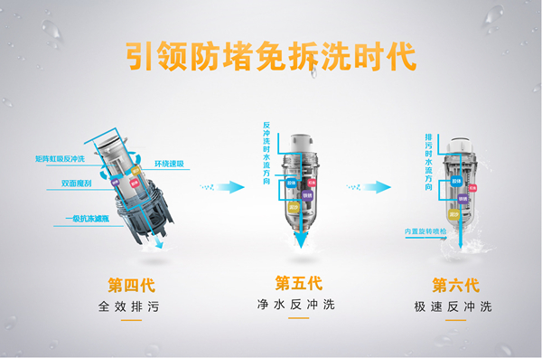 此次榮事達(dá)智能前置過濾器系列所帶來的最大不同,便是其獨(dú)有的“防堵免拆洗技術(shù)”。作為企業(yè)定向研發(fā)的專利技術(shù),有效解決了前三代傳統(tǒng)前置過濾器“易堵塞,拆洗難”的致命弊病,五款新品從第四代到第五代再到第六代,可以說是防堵免拆洗技術(shù)的梯度升級。