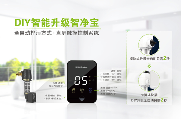 值得一提的是,為進(jìn)一步方便用戶使用,提升產(chǎn)品體驗(yàn),榮事達(dá)為第五代、第六代智能前置過濾器分別打造兩款定制化新品,量身融入智凈寶自動排污模塊,2秒即可直接加裝升級。專屬定制的DIY智凈寶配備了直屏觸控排污系統(tǒng),輕觸即可任意設(shè)置排污時(shí)間和排污天數(shù),實(shí)現(xiàn)完全自主排污;獨(dú)特排污閥閉合自檢能力,徹底排除漏水風(fēng)險(xiǎn),方便省心,使用無憂。