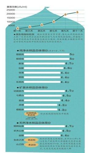 本次比較試驗(yàn)還模擬日常飲用水習(xí)慣,在設(shè)計(jì)的檢測周期內(nèi),每天取一定水樣,定時(shí)監(jiān)測菌落總數(shù)。實(shí)驗(yàn)中,大多數(shù)水樣隨著開瓶時(shí)間越來越長,菌落總數(shù)呈增長趨勢,開瓶第5-7天后,出現(xiàn)急劇增長態(tài)勢。