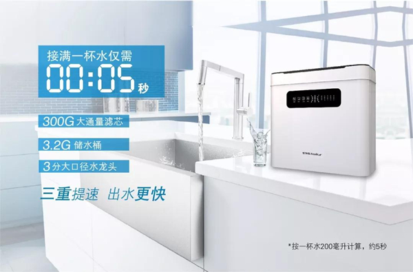 現(xiàn)代快節(jié)奏的生活下,人們對于“速度”的追求越發(fā)執(zhí)著。此次,榮事達發(fā)布的300G智能反滲透凈水機在出水速度提升上可謂是“不走尋常路”。其創(chuàng)新采用“大通量+大‘桶’量+大口徑龍頭”三重提速設(shè)計,一方面選用“300加侖超大通量濾芯”,出水速度達到傳統(tǒng)50G凈水機的6倍;另一方面,用戶可DIY選裝3.2加侖儲水桶,搭配三分大口徑凈水龍頭,進一步強化出水效率,接滿一杯200毫升水僅需5秒,讓用戶隨時享受不等待、不斷水的理想生活。