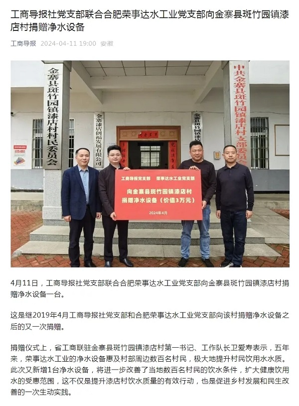 榮事達(dá)水工業(yè)公司一直積極響應(yīng)國家號召,以“樂享凈水·助建美好鄉(xiāng)村”為主題,立足安徽,深入全國各地開展公益計(jì)劃,承擔(dān)企業(yè)社會責(zé)任。未來,公司將為更多鄉(xiāng)村帶去健康飲用水,為鄉(xiāng)村振興貢獻(xiàn)力量。▼工商導(dǎo)報(bào)相關(guān)報(bào)道▼