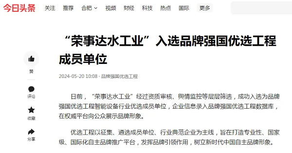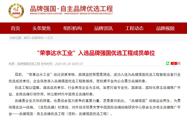 日前,“榮事達水工業(yè)”經(jīng)過資質(zhì)審核、輿情監(jiān)控等層層篩選,成功入選為品牌強國優(yōu)選工程智能設(shè)備行業(yè)優(yōu)選成員單位,企業(yè)信息錄入品牌強國優(yōu)選工程數(shù)據(jù)庫,在權(quán)威平臺向公眾展示品牌形象。