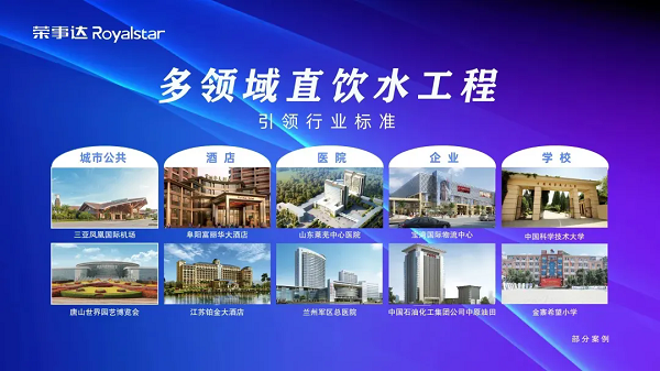 03 榮事達多領域直飲水工程 榮事達水工業(yè)公司作為凈水領域的佼佼者,已經(jīng)擁有二十年的行業(yè)積累。其產(chǎn)品覆蓋有千萬家庭、2000+企事業(yè)單位、3500+校園等場所。此外,榮事達水工業(yè)公司還獨立設計施工大型直飲水工程,包括秦始皇兵馬俑博物館、唐山世界園藝博覽會、三亞鳳凰國際機場、合福高鐵沿途站點等知名項目,以及埃塞俄比亞總統(tǒng)府、馬來西亞巴生港、贊比亞恩多拉機場、巴基斯坦默蒂亞里等海外項目,贏得了廣泛的贊譽和信賴。